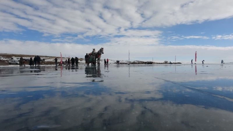 Doğu Anadolu’nun en büyük ikinci gölü olan ve kış aylarında yüzeyi tamamen buzla kaplanan Çıldır Gölü’nde, buz üstünde atlı kızakla gezinti keyfi yaklaşık bir ay gecikmeli başladı.