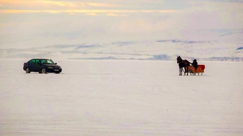 Çıldır Gölünde buz üstünde heyecanlı drift ve atlı kızak keyfi
