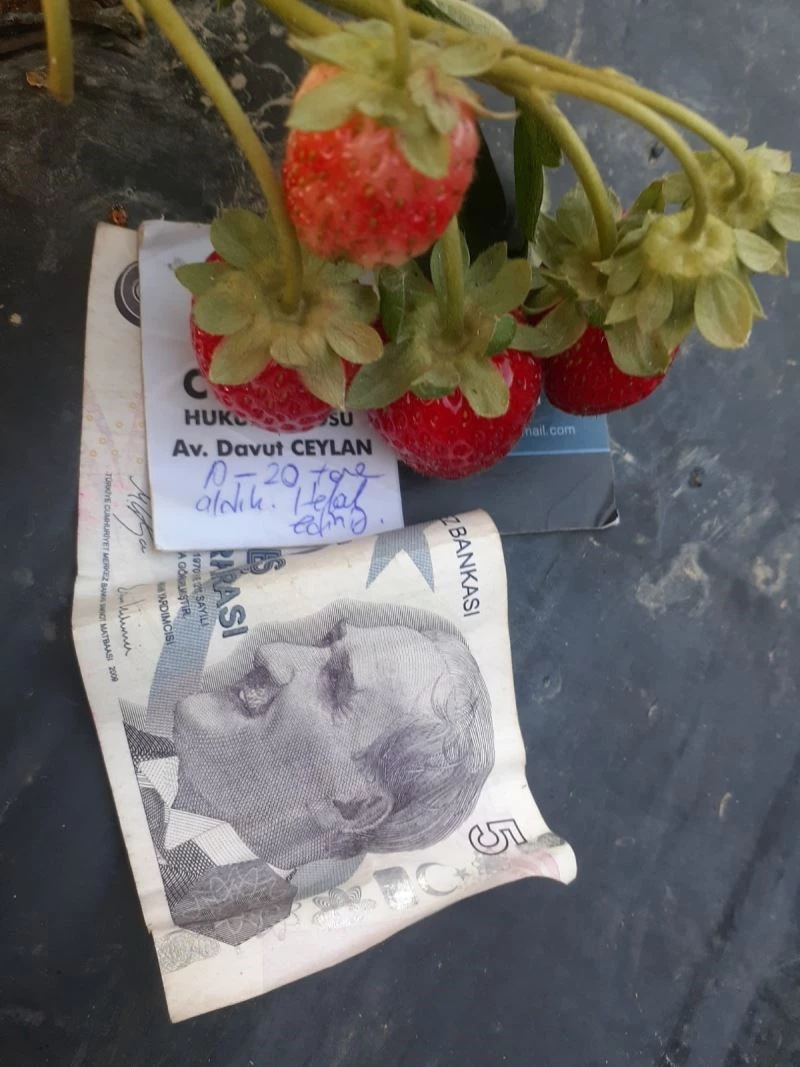 Çilek üreticisi Metin Bayram, bahçesine gittiğinde duygulandıran bir sürprizle karşılaştı. Kim olduğu bilinmeyen bir vatandaş, Bayram’a ait bahçeden aldığı çileğin parasını bir notla birlikte bahçeye bıraktı. Notun üzerine ’20 tane çilek aldık. Helal edin’ yazan vatandaş, 5 lira bırakarak bahçeden ayrıldı. Çilek toplamak için bahçesine giden Metin Bayram, bulduğu not ve para karşısında hem şaşırdı hem duygulandı.