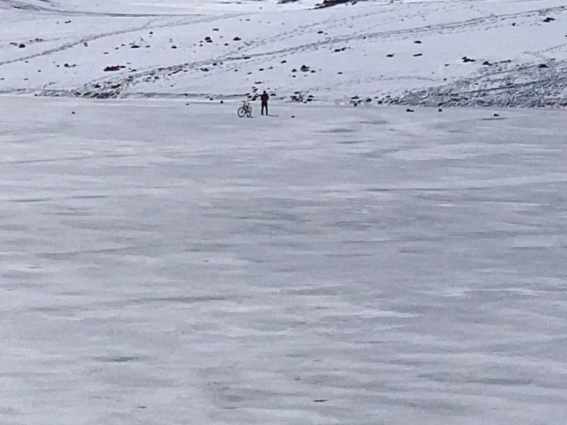 Sivas’ta büyük bir tehlikeyi göze alarak bisikleti ile donan gölün yüzeyinde yürüyen kişi görüntülendi.