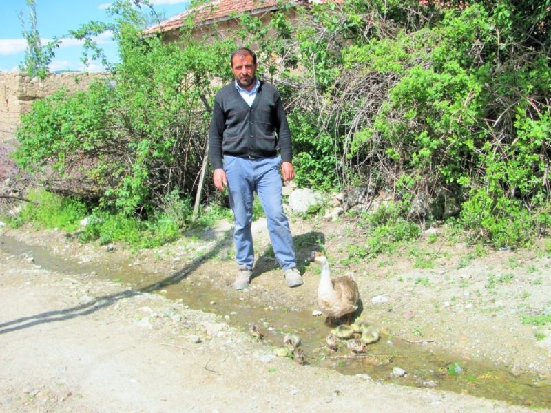 Tokat’ın Yeşilyurt ilçesinde Çin kazı, kaz yumurtaları ile birlikte kuluçkadan çıkan hindi civcivlerini yavrularından ayırmıyor.