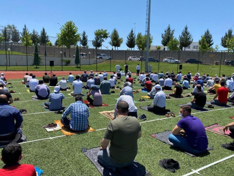 Diyarbakır’ın Çınar ilçesinde vatandaşlar, ilçe stadyumunda bir araya gelerek sosyal mesafe kuralına uyup cuma namazını kıldı.