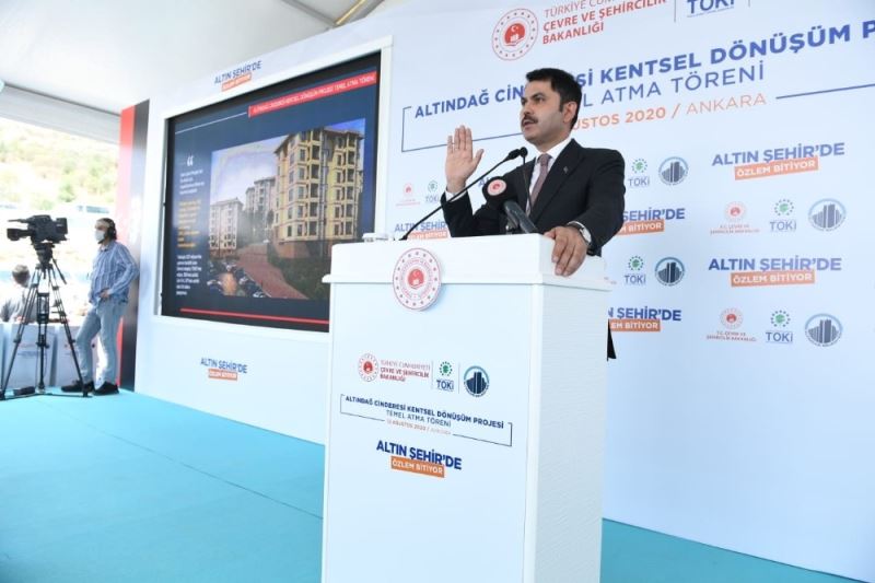 “50 bin ve 100 bin konut kampanyası kapsamında Ankara’ya toplam 7 bin 685 konut yapıyoruz. Altındağ ilçesine TOKİ tarafından şimdiye kadar kentsel dönüşüm kapsamında 4 bin 334 konut yapılmıştır. Bugün resmi temelini atacağımız Cinderesi Kentsel Dönüşüm Projesi Bakanlar Kurulu tarafından riskli alan olarak ilan edilmiş, yaklaşık 8.13 hektarlık bir alandan oluşmaktadır. 38 blok üzerine 451 adet konut, 5 adet dükkan ve 1 adet caminin yapılacağı bu proje ile düşük yoğunluklu ve yöresel unsurları ihtiva eden bir yaşam alanı oluşturulacaktır. Projenin ihale bedeli 106 milyon 425 bin lira olup, yer teslimi 27 Mart 2020 tarihinde yapılmış ve hızla inşaatına başlanmıştır. İnşaatlar 2021 yılının sonunda bitirilecek olup hak sahiplerine teslimi Bakanlığımız ve Belediyemiz tarafından yapılacak.”
