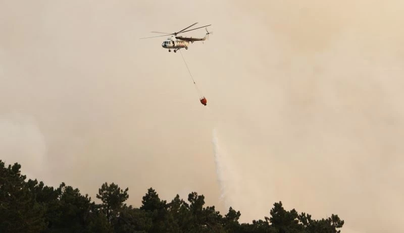 Karadan çok sayıda arazöz, iş makinesi ve personel ile kontrol altına alınmaya çalışılan yangına, havadan da 12 helikopter ve bir tanker uçakla müdahale ediliyor.