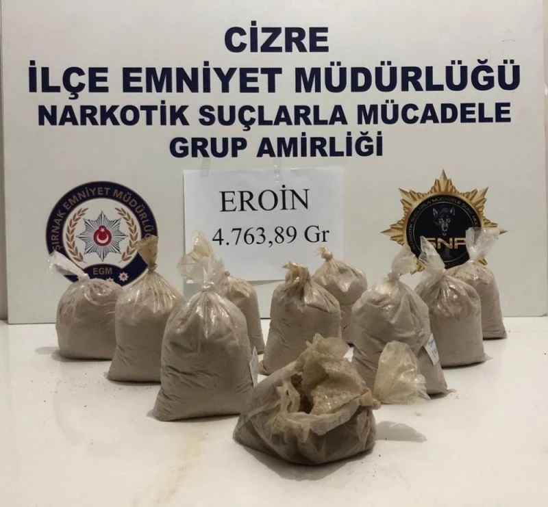 Cizre genelinde uyuşturucuyla mücadele ve uyuşturucu ticaretini önlemeye yönelik çalışmalarına devam eden Narkotik Grup Amirliği ekipleri, polis kontrol noktasında durdurdukları bir araçta dedektör köpek ile yapmış oldukları aramada 4 kilo 800 gram eroin ele geçirdi. Söz konusu olayla ilgili araçta bulunan S.Y. (22) ve S.Y. (21) Cumhuriyet Savcısının talimatı ile gözaltına alınarak sorgulanmak üzere emniyet müdürlüğüne götürüldü.