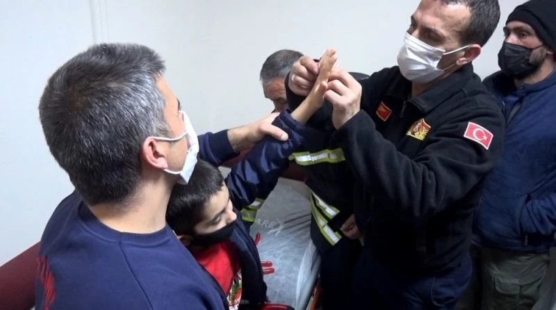 Hastaneye gelen itfaiye ekipleri yaklaşık 1 saat süren çalışma sonrasında çocuğun parmağındaki metali keserek çıkarmayı başardılar.