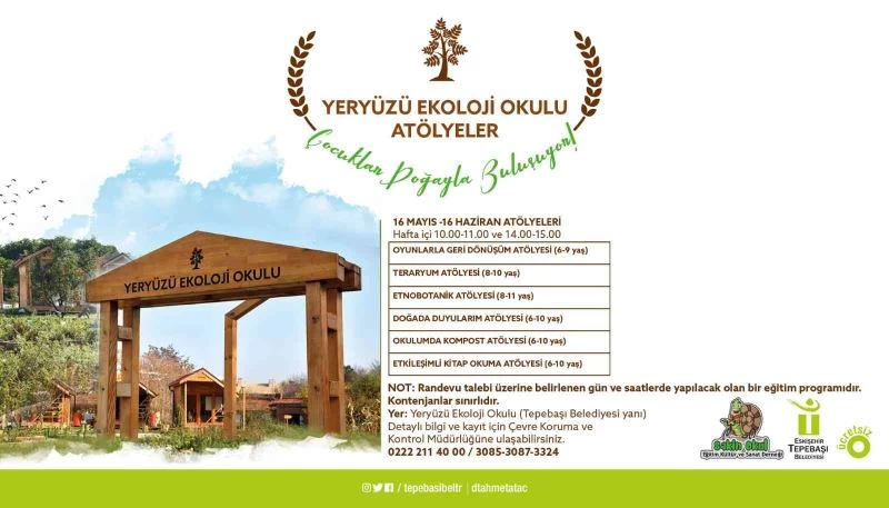 Tepebaşı Belediyesi Hizmet Binası yanında hazırlanan alanda faaliyetlerini gerçekleştiren Yeryüzü Ekoloji Okulu; doğayla ilişki kurmayı, doğaya erişimi, bir arada yaşama kültürünü, sürdürebilirliği, yerel ekosistemle oynamayı, toplumsal aktivizmi, mekanı tanımayı ve mekan bilincini ön plana çıkarmayı amaçlıyor. Yeryüzü Ekoloji Okulu’nda düzenlenen yeni dönem atölye çalışmaları arasında; 6-9 yaş için Oyunlarla Geri Dönüşüm Atölyesi, 8-10 yaş için Teraryum Atölyesi, 6-10 yaş için Doğada Duyularım Atölyesi, Okulumda Kompost Atölyesi, Etkileşimli Kitap Okuma Atölyesi ve Etnobotanik Atölyesi yer alıyor. Atölyeler 16 Mayıs-16 Haziran 2022 tarihlerinde, hafta içi saat 10.00-11.00 ve 14.00-15.00 saatleri arasında gerçekleştirilecek. Ayrıca okullar da Tepebaşı Belediyesi ile iletişime geçerek gruplar halinde atölye çalışmalarına katılabiliyor.