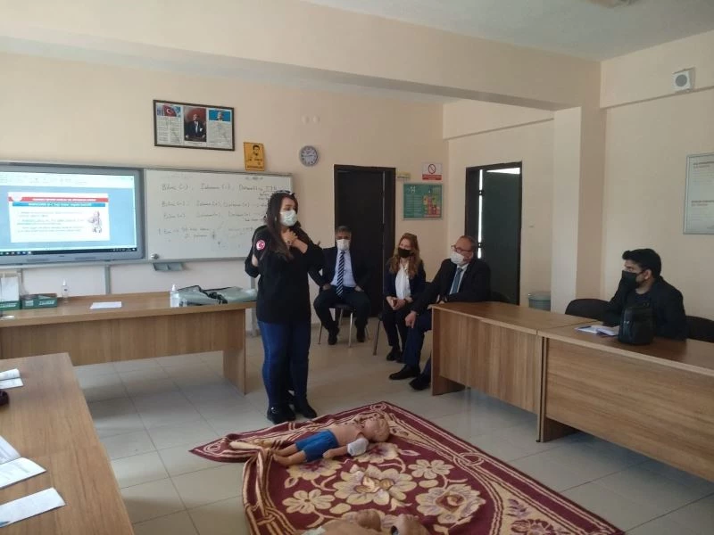 Milli Eğitim Müdürü Ahmet Alagöz, Bakanlığın öğrenci, öğretmen ve velilerimizde ilk yardım bilincinin geliştirilmesi, yaralanma ve sakatlanmaların azaltılması amacıyla başlattığı, "Çocuklarımız İlk Yardımla Daha Güvende" projesi kapsamında Yunus Emre Mesleki ve Teknik Anadolu Lisesinde verilen ilk yardım kursunu ziyaret etti.