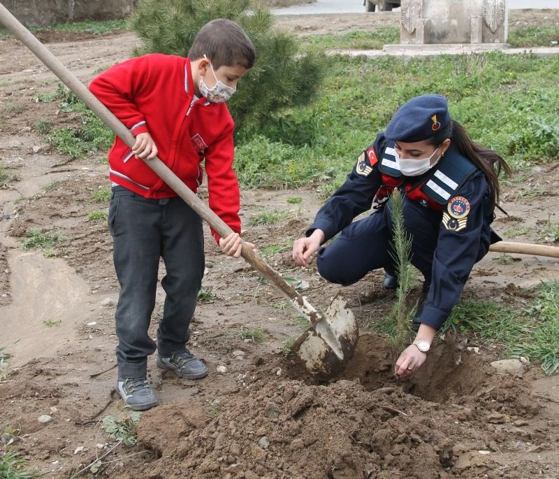 Çanakkale İl Jandarma Komutanlığı ekipleri, ilkokul öğrencileriyle birlikte fidan dikti.