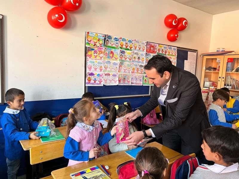 Digor Kaymakamı Orhan Gazi Karakaş, çocuklar okulu sevsin diye oyuncak hediye ediyor.