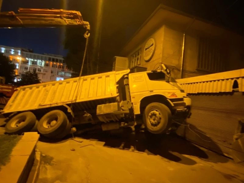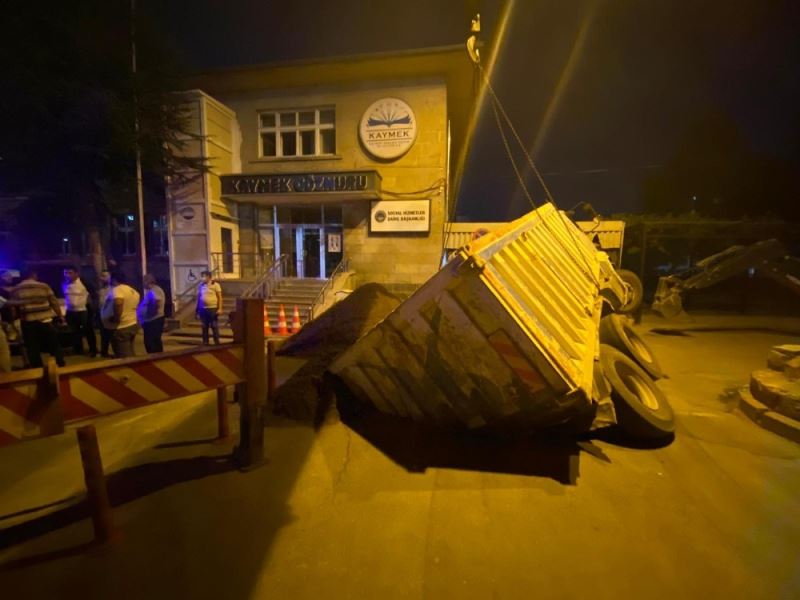 Kayseri’nin Kocasinan ilçesinde kum yüklü kamyonun ağırlığına dayanamayan yol çökünce kamyonet adeta şaha kalktı.