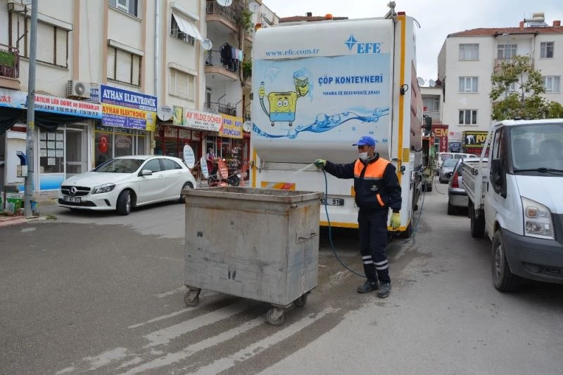Korkuteli ilçesinde yeni tip Korona virüse (Covid-19) karşı dezenfeksiyon çalışmaları kapsamında ilçede bulunan çöp konteynerleri dezenfekte edildi.