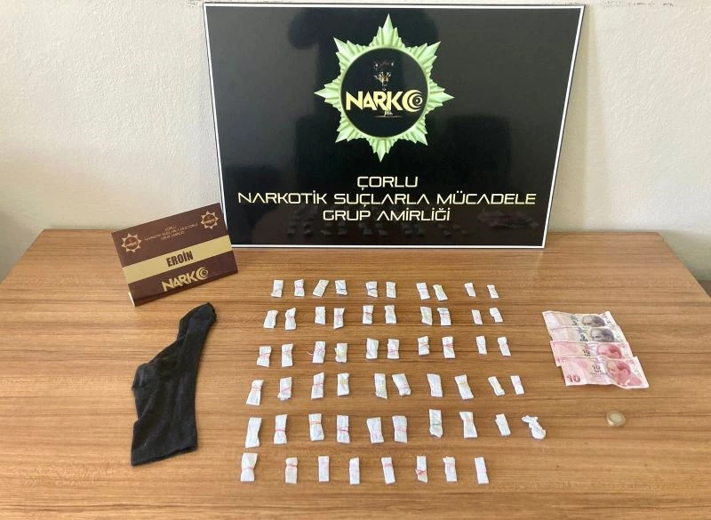 Tekirdağ İl Emniyet Müdürlüğü Narkotik Suçlarla Mücadele Şube Müdürlüğü Çorlu Grup Amirliği görevlilerince uyuşturucu ve uyarıcı madde ticareti yapan şahıslara yönelik yapılan çalışmalar kapsamında halk arasında Kore Mahallesi olarak da anılan Hıdırağa Mahallesi’nde tespit edilen bir şahsın üzerinde ve bekleme yaptığı yerde yapılan aramada satışa hazır şekilde fişeklenmiş halde 58 fişek eroin maddesi ele geçirildi.