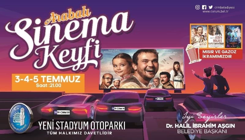 Arabalı sinema gösteriminin Çorum’da ilk kez yapılacağını ve Çorum halkının kendilerinden yoğun olarak talepte bulunduğunu dile getiren Başkan Aşgın, “3-4-5 Temmuz akşamlarında, hayatımız boyunca sadece Yeşilçam filmlerinde gördüğümüz o nostaljik ve güzel anları hep birlikte canlı canlı yaşayacağız. Yeni stadımızın otopark kısmında birbirinden güzel filmleri hemşehrilerimizin seyrine sunacağız. Çorum akşamlarına renk katacak bu güzel etkinliğe tüm hemşehrilerimizi davet ediyoruz.” şeklinde konuştu.