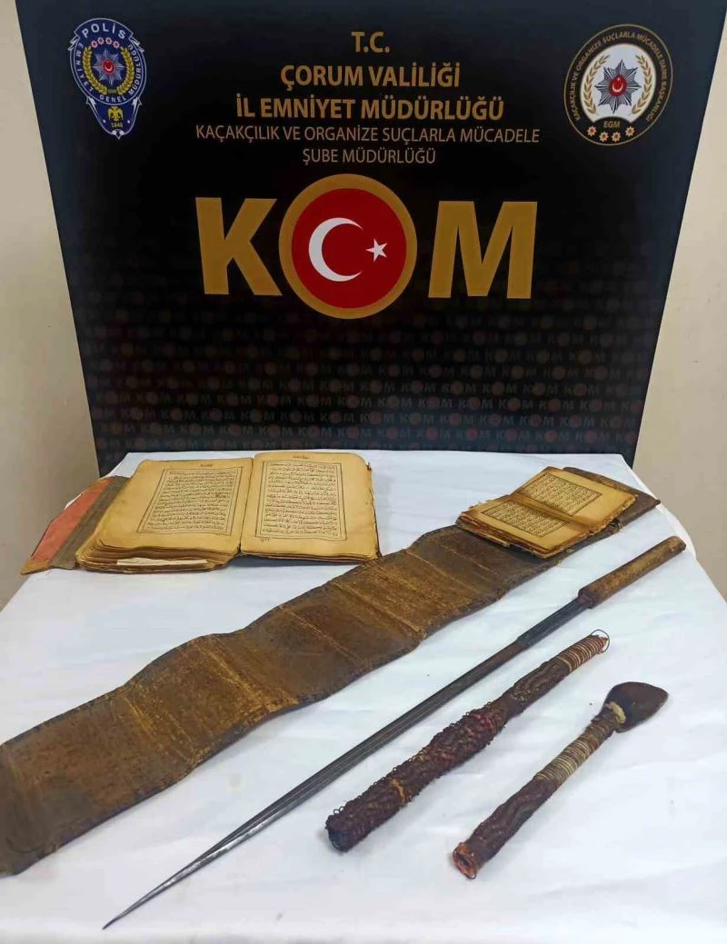 Çorum’un Sungurlu ilçesinde düzenlenen operasyondan tarihi eser olduğu düşünülen 2 adet Kur’an-ı Kerim, kama ve işlemeli kın ele geçirildi.