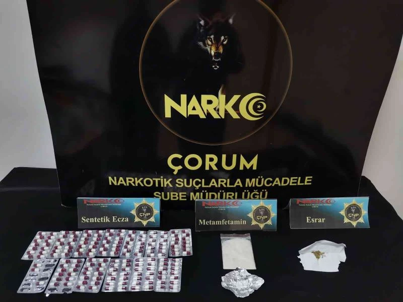 Çorum polisi tarafından zehir tacirlerine yönelik düzenlenen uyuşturucu operasyonunda 23,12 gram metamfetamin maddesi ile 166 adet sentetik ecza maddesi ele geçirildi.