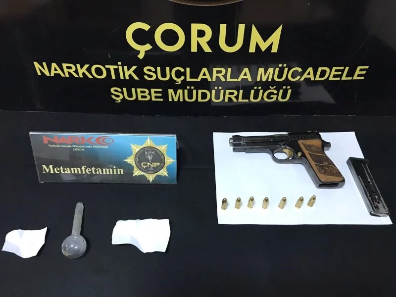 Çorum Emniyet Müdürlüğü Narkotik Suçlarla Mücadele Şube Müdürlüğü ekiplerince düzenlenen operasyonda, uyuşturucu madde ile ruhsatsız tabanca ele geçirildi.
