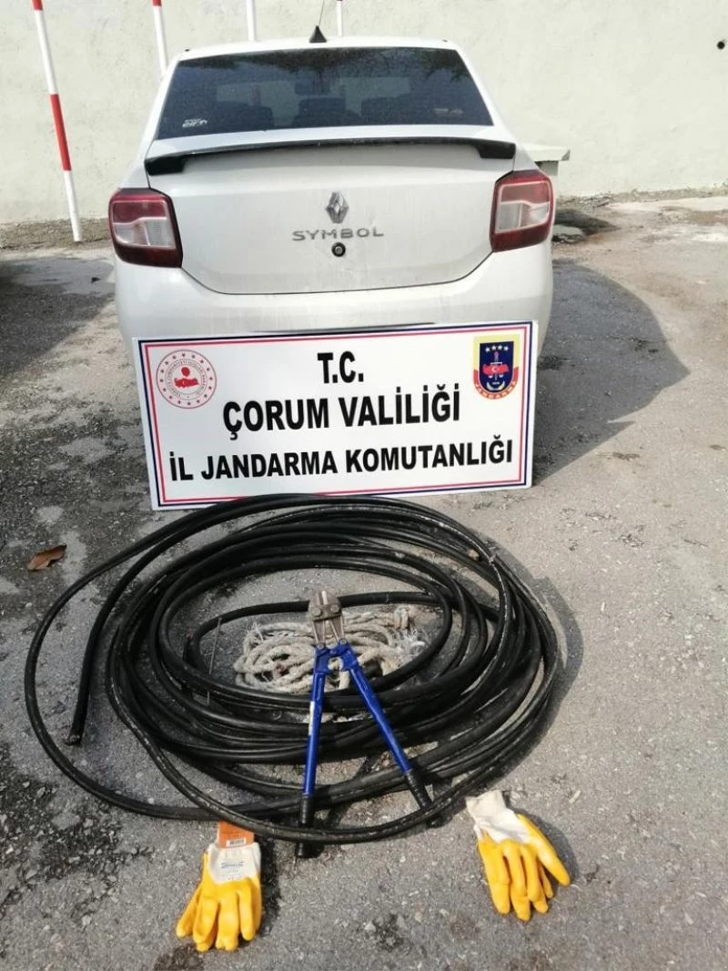 Çorum İl Jandarma Komutanlığı sorumluluk bölgesinde son dönemde meydana gelen haberleşme ve enerji nakil kablosu hırsızlığı olaylarına yönelik yürütülen çalışmalar esnasında, İskilip ilçesi Beyoğlan Köyü mevkiinde akşam saatlerinde icra edilen devriye esnasına şüpheli bir şahıs, kesilmiş halde 40 metre uzunluğunda telefon kablosu, tel kesme makası ve olayda kullanılan araç ile birlikte Dodurga İlçe J. K.lığı ekiplerince Alpağut köyünde yakalandı. İskilip Cumhuriyet Savcılığının talimatları doğrultusunda soruşturma devam ediyor.