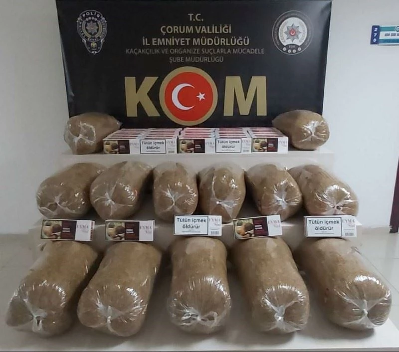 Çorum Emniyet Müdürlüğü ekiplerince düzenlenen operasyonda çok sayıda kaçak makaron sigara ile tütün ele geçirildi.