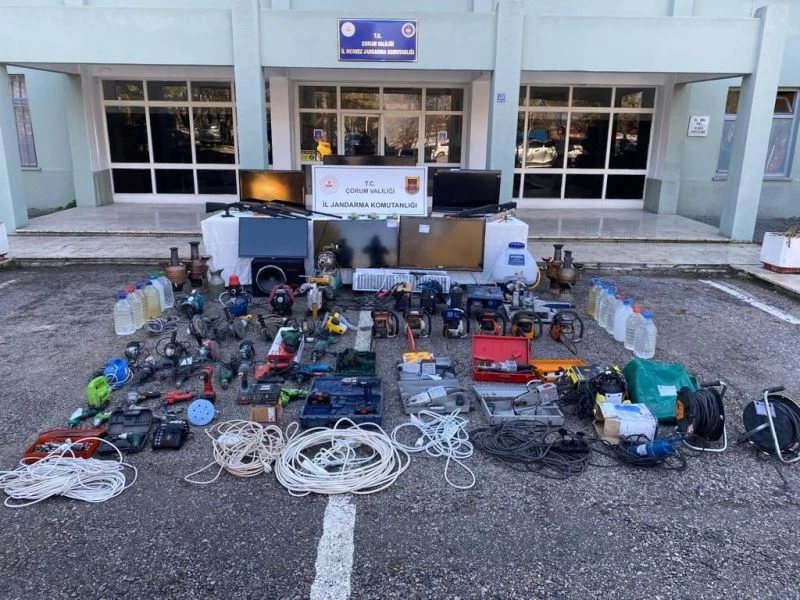 Edinilen bilgiye göre, bağ, bahçe, tarla ve evden hırsızlık olaylarının önlenmesi, meydana gelen hırsızlık olaylarının faillerinin tespit edilerek yakalanması maksadıyla oluşturulan özel ekipler tarafından yürütülen çalışmalar sonucunda, tespit edilen depo ve iş yerine düzenlenen operasyonlarda, geçmiş dönemlerde Çorum İl Merkez ile Mecitözü ilçelerinde meydana gelen 20, merkez ilçe Polis Bölgesi ve Amasya ilinde meydana gelen toplam 22 hırsızlık olayında çalındığı belirlenen; 6 adet televizyon, 3 adet av tüfeği, 138 adet 9 milimetre çapında tabanca fişeği, 8 adet motorlu testere, 2 adet kaynak makinası, 7 adet elektrikli el matkabı, 8 adet şarjlı vidalama/matkap cihazı, 2 adet şarjlı matkap şarj aleti, 4 adet şarjlı matkap bataryası, 9 adet spiral makinası, 5 adet plastik boru kaynak makinesi, 1 adet dairesel tezgah testeresi, 5 adet hidrofor motor, 2 adet dalgıç pompa, 1 adet dekupaj testere, 2 adet kılıç testere, 4 adet bakır semaver, 1 adet bakır güğüm, 1 adet fayans kesme makinası, 1 adet sırt tipi ilaçlama makinası, 1 adet el yapımı pala bıçak, 6 adet seyyar uzatma kablosu ile 92 litre kaçak rakı ele geçirildi.