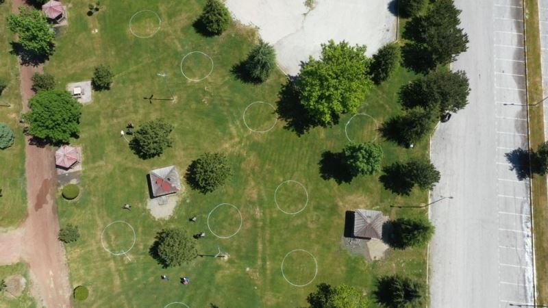 Çorum Belediyesi koronavirüs tedbirleri kapsamında parklarda fiziki mesafeyi korumak amacıyla bir takım çalışmalar yaptı. Belediye, parklardan yararlanacak vatandaşların fiziki mesafe düzenlemesi için dairesel çizgiler çizdi.