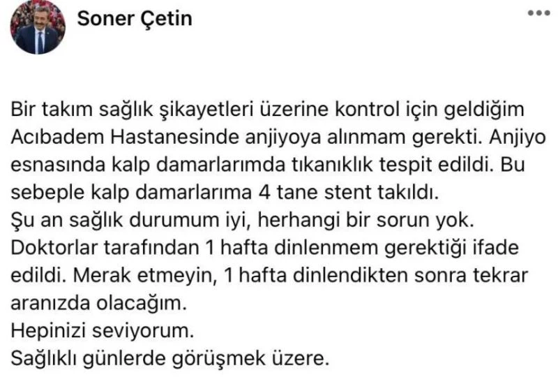 Sosyal medyada yaptığı paylaşımda Başkan Çetin, “Bir takım sağlık şikayetleri üzerine kontrol için geldiğim Acıbadem Hastanesinde anjiyoya alınmam gerekti. Anjiyo esnasında kalp damarlarımda tıkanıklık tespit edildi. Bu sebeple kalp damarlarıma 4 tane stent takıldı. Şu an sağlık durumum iyi, herhangi bir sorun yok. Doktorlar tarafından 1 hafta dinlenmem gerektiği ifade edildi. Merak etmeyin, 1 hafta dinlendikten sonra tekrar aranızda olacağım. Hepinizi seviyorum. Sağlıklı günlerde görüşmek üzere” ifadelerini kullandı.