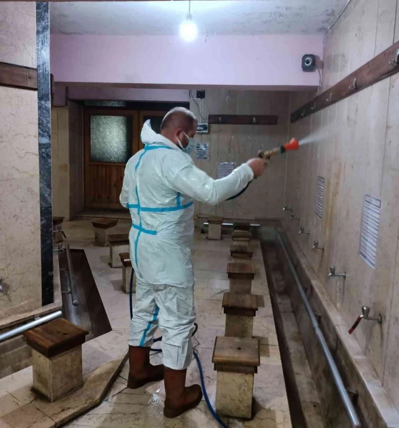 DÜZCE – Cumayeri Belediyesi ekipleri kente bulunan camilerin tuvalet ve şadırvanlarında dezenfektanla temizlik çalışması yaptı.