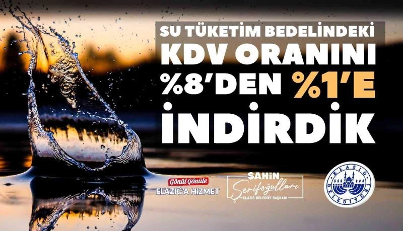 Başkan Şerifoğulları sosyal medya hesabı üzerinden yaptığı açıklamada, "Cumhurbaşkanımız Recep Tayyip Erdoğan’ın açıkladığı karar ile enflasyonla mücadele kapsamında Elazığ Belediyesi olarak su tüketim bedelindeki KDV oranını yüzde 8’den yüzde 1’e indirdik şehrimize hayırlı olsun" dedi.