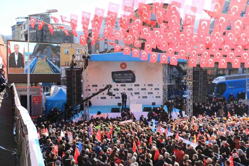 AK Parti Genel Başkanvekili Binali Yıldırım’ın kürsüden karşıladığı Cumhurbaşkanı Erdoğan, “Sizinle Zonguldak’ta yüz yüze görüşmek, hasbihal etmek, hasret gidermek için iki hafta önce planladığımız ziyareti olumsuz hava şartları nedeniyle bugüne ertelemek zorunda kalmıştık. Bu günde soğuk algınlığı ve sesimizin kısıklığı sebebiyle Zonguldak’a gelemedik. Buna rağmen Prof. Dr. Teoman Duralı Tünelleri başka olmak üzere şehrimize kazandırdığımız yatırımların resmi açılışını canlı bağlantı ile de olsa gerçekleştirmek istedik. Cumhuriyetle birlikte il statüsü kazanan Zonguldak hep çalışmanın alın terinin emeğin sembolü olmuştur. Madenlerde ve demir çelik fabrikalarında çalışan işçilerin başlarındaki baret, ellerindeki kara, yüreklerindeki ateş bu şehrin üretim gücünün sembolüdür. Filyos projesi başta olmak üzere yeni yatırımlarla tüm bölgenin yeni lojistik üssü haline dönen bu şehrin üstünde artık yeni bir sayfa açılıyor. Zonguldak’a bu aydınlık geleceğe uygun yatırımlarla büyük ve güçlü Türkiye’nin parlayan yıldızı haline getirme gayretindeyiz. Resmi açılışlarını yapacağımız yatırımlar da buna yöneliktir. Tünellere geçtiğimiz aylarda ülkemizin fikir ve ilim dünyası bu şehrin evladı Prof. Dr. Teoman Duralı’nın ismini verdik. Yapımı tamamlanan Zonguldak-Kilimli yolunun Prof. Dr. Teoman Duralı 1 ve 2 tünellerini Karaelmas ve Uzunkum kavşaklarının resmi açılışını buradan yapıyoruz. Yatırım tutarı 1 milyar 150 milyon lira olan bu proje sayesinde lira olan bu proje sayesinde 40 dakika aşuren ulaşım 5 dakikaya inecek. Yolun yarı yarıya kısalması, seyahat süresinin azalması sayesinde Zonguldak ile Kilimli adeta bütünleştirmiş oluyoruz. Açılışını yapacağımız bir başka ulaştırma yatırımı Zonguldak-Ereğli yolu Değirmenağzı 1-2 tünelleri, Kozlu viyadüğü, Ereğli hastane, Karaelmas köprü ve kavşaklarıdır. Yatırım tutarı 1 milyar 180 milyon lira olan bu proje sayesinde Zonguldak ile en büyük ilçesi Kdz. Ereğli arasındaki ulaşımı daha hızlı ve konforlu şekilde sağlanabilecektir. Her iki istikametteki tünel, kavşak projeleriyle şehrimize hayırlı olmasını diliyorum. Zonguldak’ın kalkınmanın temel altyapısı olan ulaşım da bu imkanları en iyi şekilde değerlendireceğine hiç şüphe duymuyorum. Şehrimizin merkezindeki ve çeşitli ilçelerindeki enerji iletim hatları, trafo merkezleri gibi alt yapılar yenilendi, genişletildi. Toplamda 326 milyon liralık yatırımla tamamlanan enerji projeleriyle üç beldemize getirilen doğalgaz hatlarımızın resmi açılışın yapıyoruz. TOKİ tarafından Üzülmez, Terakki mahallelerimizle Çaycuma, Devrek ilçelerimize 266 milyon liralık yatırımla bin 693 konut, cami ve ticaret merkezi inşaatı tamamlandı. TOKİ projelerinin açılışını da buradan gerçekleştiriyoruz. Çeşitli kurum, üniversite ve belediyelerimize ait yatırımlarımızı da buradan yapıyoruz. Toplamda 3 milyar 404 milyon liralık yatırımlar hayırlı olmasını diliyorum. Bu yatırımların Zonguldak’a kazandırılmasında emeği geçen bakanlıklarımıza kurumlarımıza, belediyelerimize, işçisinden mühendisine herkese çok teşekkür ediyorum” dedi.