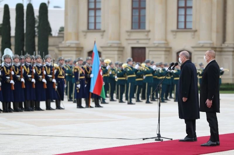 Cumhurbaşkanı Recep Tayyip Erdoğan, Azerbaycan’ın Ermenistan’a karşı Dağlık Karabağ’daki zaferini kutlamak için düzenlenen Zafer Geçidi Töreni’ne katılmak üzere Azerbaycan’a dün akşam saatlerinde gelmişti. Cumhurbaşkanı Erdoğan, Aliyev’in kabri ve şehitlik ziyaretlerinin ve Zafer Geçidi Töreni’nin ardından, resmi temasları kapsamında geldiği Bakü’deki Gençlik Sarayı’nda Azerbaycan Cumhurbaşkanı İlham Aliyev tarafından Gençlik Sarayı’nda resmi törenle karşılandı. İki ülkenin milli marşlarının okunduğu törende, Erdoğan askeri kıtayı selamladı.