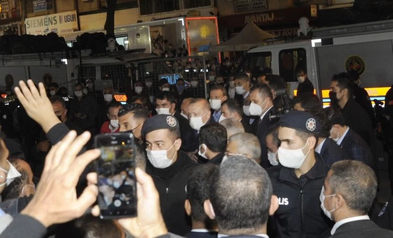 Cumhurbaşkanı Recep Tayyip Erdoğan, İzmir’deki 6,6 büyüklüğündeki depremin ardından yıkılan Rıza Bey Apartmanı’na gelerek incelemelerde bulundu.