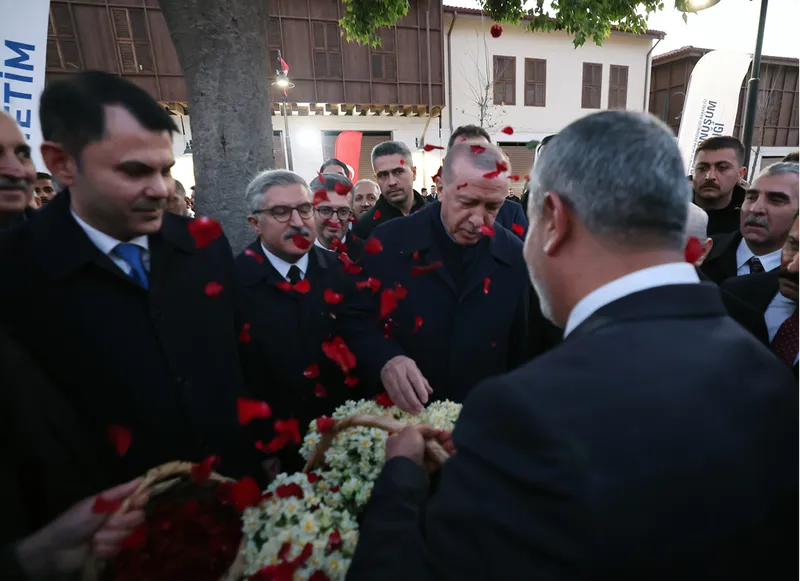 Daha sonra Habib-i Neccar Camii'nin bulunduğu ve dünyanın ilk aydınlatılan caddesi olan Kurtuluş Caddesi'ne geçen Erdoğan'a, TBMM Başkanı Numan Kurtulmuş, MHP Genel Başkanı Devlet Bahçeli ve BBP Genel Başkanı Mustafa Destici de eşlik etti.