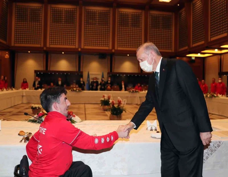 Cumhurbaşkanlığı Külliyesi’nde gerçekleşen ve yaklaşık 1,5 saat süren kabulde Erdoğan, sporcularla birlikte yemek yedi.