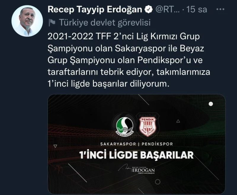Cumhurbaşkanı Recep Tayyip Erdoğan sosyal medya hesabı üzerinden, 2021-2022 Sezonu TFF 2. Lig Kırmızı Grup Şampiyonu olan Sakaryaspor’u tebrik etti.