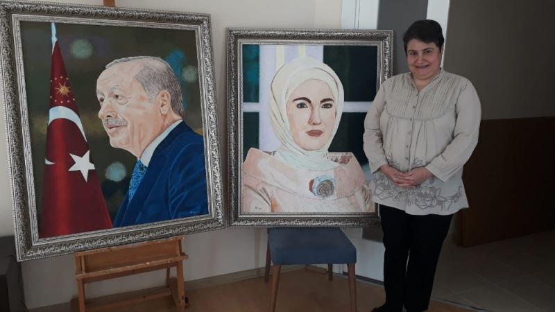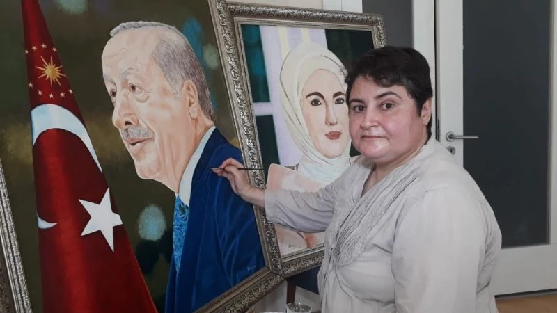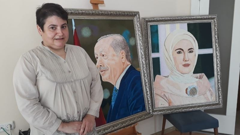 İzmir’in Çiğli ilçesinde yaşayan Ayşe Derya Kalaklı (48), 4 aylık çalışma sonucu çizdiği Cumhurbaşkanı Recep Tayyip Erdoğan ve eşi Emine Erdoğan’ın portre tablosunu, kendilerine hediye etmek istediğini söyledi.