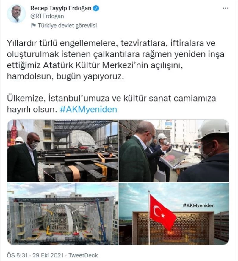 Cumhurbaşkanı Recep Tayyip Erdoğan, 29 Ekim Cumhuriyet Bayramı kutlamalarıyla birlikte bu akşam açılışı yapılacak olan Atatürk Kültür Merkezi (AKM) ile ilgili sosyal medya hesabı Twitter’dan paylaşımda bulundu. Cumhurbaşkanı Erdoğan, “Yıllardır türlü engellemelere, tezviratlara, iftiralara ve oluşturulmak istenen çalkantılara rağmen yeniden inşa ettiğimiz Atatürk Kültür Merkezi’nin açılışını, hamdolsun, bugün yapıyoruz. Ülkemize, İstanbul’umuza ve kültür sanat camiamıza hayırlı olsun” dedi.