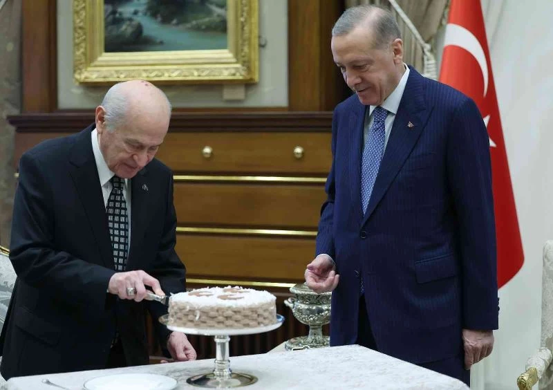 Cumhurbaşkanı Recep Tayyip Erdoğan, MHP Genel Başkanı Devlet Bahçeli’yi Cumhurbaşkanlığı Külliyesi’nde kabul etti. Yaklaşık bir saat süren görüşmede Cumhurbaşkanı Erdoğan, Bahçeli’ye doğum günü sürprizi yaptı. Görüşmede üzerinde üç hilal bulunan pasta kesildi.
