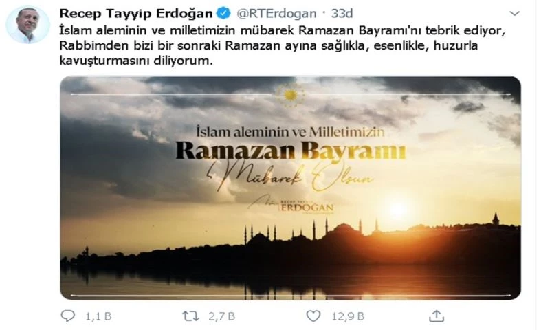 Cumhurbaşkanı Recep Tayyip Erdoğan, Twitter hesabından yaptığı paylaşımda, "İslam aleminin ve milletimizin mübarek Ramazan Bayramı’nı tebrik ediyor, Rabbimden bizi bir sonraki Ramazan ayına sağlıkla, esenlikle, huzurla kavuşturmasını diliyorum" ifadelerin kullandı.
