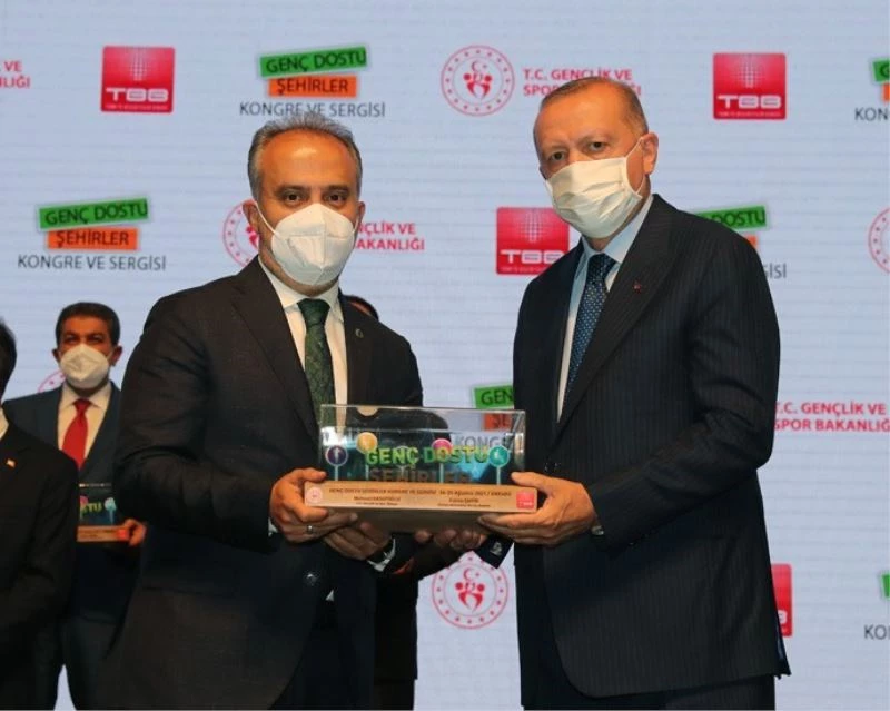 Türkiye Belediyeler Birliği ile Gençlik ve Spor Bakanlığının ev sahipliğinde düzenlenen Genç Dostu Şehirler Kongre ve Sergisi, Cumhurbaşkanı Recep Tayyip Erdoğan’ın katılımlarıyla Ankara ATO Congresium Kongre ve Sergi Merkezi’nde yapıldı. Kongrede, Genç Dostu Şehirler Fikir ve Proje Yarışması’na katılan belediyelerden dereceye giren 22 belediyeye ödülleri verildi. Bursa Büyükşehir Belediyesi de gençleri merkeze alan projeleri başta olmak Büyükşehir Gençlik Kulübü uygulamasıyla ‘Genç Dostu Şehir Ödülü’ne layık görüldü. Cumhurbaşkanı Recep Tayyip Erdoğan’ın Bursa’nın ödülünü Büyükşehir Belediye Başkanı Alinur Aktaş’a verdi.