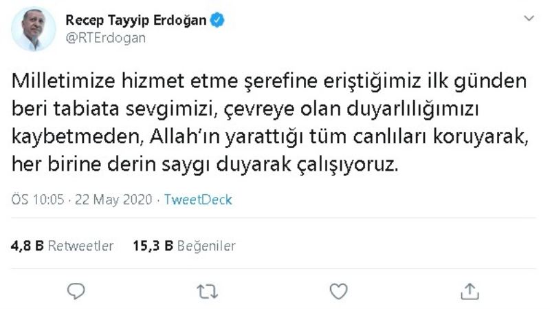 “İnsanca bir yaşam için en az hava kadar, su kadar, toprak kadar ihtiyacımız olan biyolojik çeşitliliğin önemine dikkat çekmek amacıyla BM tarafından ilan edilen 22 Mayıs Dünya Biyolojik Çeşitlilik Günü’nü tebrik ediyorum. Milletimize hizmet etme şerefine eriştiğimiz ilk günden beri tabiata sevgimizi, çevreye olan duyarlılığımızı kaybetmeden, Allah’ın yarattığı tüm canlıları koruyarak, her birine derin saygı duyarak çalışıyoruz. Tıpkı 26 yıl önce bir bataklığa dönüşmüş olan Haliç’i tüm canlılar için masmavi, tertemiz bir yaşam alanına çevirdiğimiz gibi, ülkemizin dört bir yanında biyolojik çeşitliliği korumaya ve artırmaya devam edeceğiz" dedi.