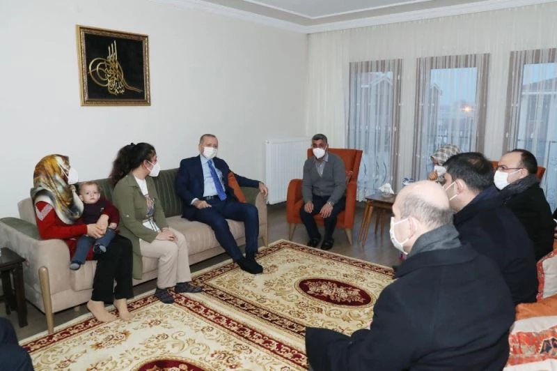 Cumhurbaşkanı Recep Tayyip Erdoğan, Elazığ’da katıldığı deprem konutları anahtar teslim töreni sonrasında yeni konutları gezdi. Erdoğan, bir ailenin de davetini geri çevirmeyerek evine misafir oldu.