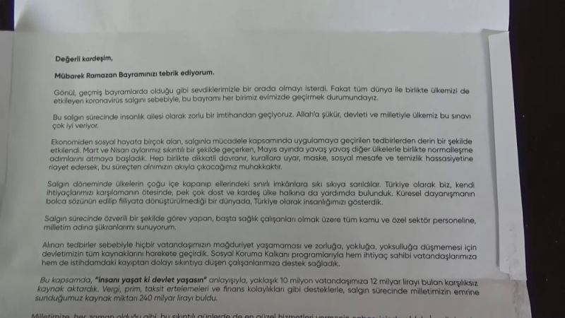 DÜZCE (İHA) – Cumhurbaşkanı Recep Tayyip Erdoğan, Türkiye genelinde Ramazan Bayramı boyunca sokağa çıkma yasağı ile ilgili olarak Düzce’de bulunan evlere mektup gönderdi. Mektup da Korona virüs ile mücadele kapsamında yapılan çalışmalarda anlatıldı.