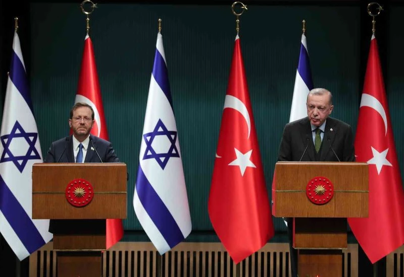 Cumhurbaşkanı Recep Tayyip Erdoğan, İsrail Cumhurbaşkanı Isaac Herzog’u Ankara’da resmi törenle karşıladı. Erdoğan ve Herzog görüşmenin ardından ortak basın açıklaması gerçekleştirdi. İsrail Devlet Başkanı Herzog’u Türkiye’de ağırlamaktan memnuniyet duyduğunu ifade eden Erdoğan, "Bu tarihi ziyaretin Türkiye-İsrail ilişkilerinde yeni bir dönüm noktası olacağına inanıyorum. Müşterek hedefimiz, ülkelerimiz arasında ortak çıkarlara dayalı karşılıklı hassasiyetlere uygun şekilde Türkiye- İsrail ilişkilerinin gelişmesi ve güçlenmesi ülkelerimiz açısından olduğu kadar bölgesel istikrar açısından da önemli" dedi. Erdoğan, "Birlikte yaşama kültürüne yeniden katlı sağlamak bizim elimizdedir. Pozitif bir gündem içinde ikili işbirliği ve bölgesel İşbirliği potansiyelini hayata geçirmemiz özellikle önem taşıyor. Ticaret hacmimiz salgına rağmen yüzde 36’ya yakın bir artış göstererek geçtiğimiz sene 8 buçuk milyar dolar seviyesine ulaşmıştır. Ortak çabalarımızla bu rakamı 2022 senesinde 10 milyar dolara taşıyacağımıza inanıyorum" açıklamasında bulundu.