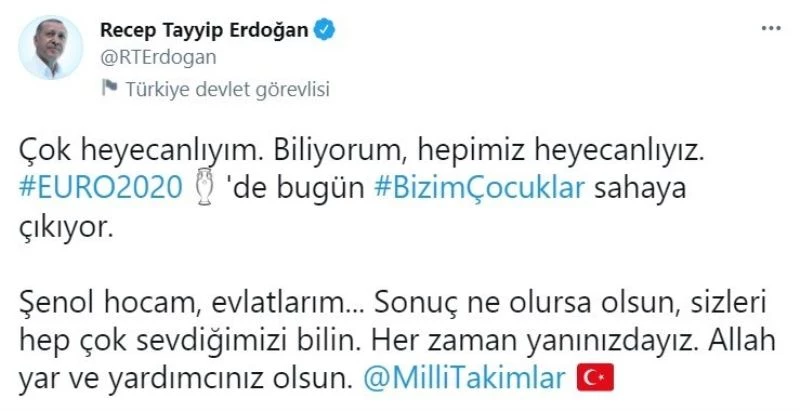 2020 Avrupa Futbol Şampiyonası açılış maçında İtalya ile karşılaşacak A Milli Futbol Takımı’na bu mücadele öncesinde Cumhurbaşkanı Recep Tayyip Erdoğan’dan destek mesajı geldi. Sosyal medya hesabından paylaşım yapan Cumhurbaşkanı Erdoğan, "Çok heyecanlıyım. Biliyorum, hepimiz heyecanlıyız. #EURO2020’de bugün #BizimÇocuklar sahaya çıkıyor. Şenol hocam, evlatlarım... Sonuç ne olursa olsun, sizleri hep çok sevdiğimizi bilin. Her zaman yanınızdayız. Allah yar ve yardımcınız olsun" ifadelerini kullandı.