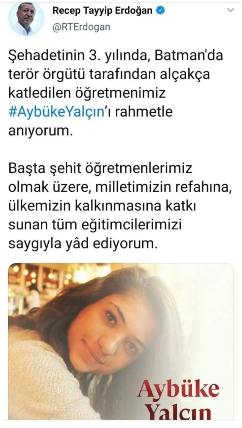 Cumhurbaşkanı Recep Tayyip Erdoğan, Batman’ın Kozluk ilçesinde terör örgütü üyelerinin saldırısı sonucu şehit olan müzik öğretmeni Aybüke Yalçın’ı andı.