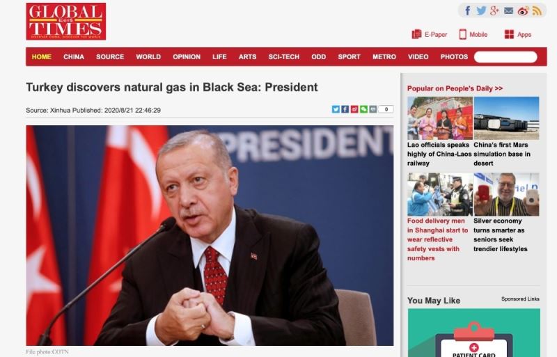 Çin’de iktidardaki Komünist Parti’nin İngilizce yayımlanan resmî gazetelerinden Global Times’in haberinde, Cumhurbaşkanı Recep Tayyip Erdoğan’ın Türkiye’nin Karadeniz’de büyük miktarda doğal gaz rezervi keşfettiğini söylediği aktarıldı. Haberde, Türkiye’nin Fatih sondaj gemisinin, Tuna-1 kuyusunda 320 milyar metreküplük bir doğal gaz rezervi keşfettiğine işaret edilerek, Cumhurbaşkanı Erdoğan’ın “Türkiye, tarihindeki en büyük doğal gaz keşfini yaptı” ifadelerine yer verildi.