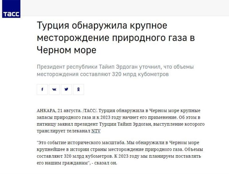 Rusya’nın önemli haber ajanslarından biri olan Ria Novosti’de yine Erdoğan’ın aktardığı bilgilerden yola çıkarak bulunan doğal gaz rezervi ile ilgili teknik bilgilere yer verirken haberinin başlığında ise “Türkiye, Karadeniz’de doğal gaz buldu” başlığını kullandı. Rusya’nın önemli haber kanallarından biri olan iz.ru’da Erdoğan’ın açıklamaları geniş yer bulurken haberde Türkiye’nin Akdeniz ile Karadeniz’de doğal gaz ve petrol arama çalışmaları hakkında yaşanan süreçler hatırlatıldı. Rusya’da yayın yapan önemli ekonomi portallarından İnvesting.ru ise Erdoğan’ın ifadelerini kullanarak duyurduğu haberde bulunan doğal gaz rezervinin ülke tarihinde bugüne kadar keşfedilen en büyük rezerv olduğuna dikkat çekti.