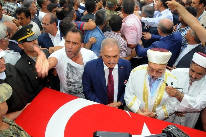 Osmaniye`de şehit Jandarma Yüzbaşı Ali Alkan`ın cenaze törenindeki protestolar sırasında Cumhurbaşkanı Recep Tayyip Erdoğan`a hakaret ettikleri iddiasıyla 2 kişi tutuklandı. Şırnak`ta 21 Ağustos`ta PKK`lı teröristlerin roketatar ve otomatik silahlarla düzenledikleri saldırıda şehit olan 32 yaşındaki Jandarma Yüzbaşı Ali Alkan`ın 23 Ağustos`ta memleketi Osmaniye Envar`ul Hamit Camii`nde düzenlenen cenaze töreninde gerginlikler yaşandı.Ak Parti Osmaniye Milletvekilleri Suat Önal ile Mücahit Durmuşoğlu ve Ak Parti İl Başkanı Hamza Tor`un alana gelip cenaze namazı için ön safa geçmek istediği sırada kalabalıktan bir kişi, "Sizin burada işiniz yok. Defolun buradan" diyerek tepki gösterdi. Adından da sloganlar atılıp protestolar artınca, cenaze namazı hızla kıldırılarak gerilim önlenmeye çalışılmıştı. Bu sırada şehit yüzbaşının ağabeyi Yarbay Ahmet Alkan da tabut başında acı içindeki isyan sözleri ile dikkat çekti.Törenden sonra İl Emniyet Müdürlüğü kamera görüntülerini incelemeye aldı. Yapılan detaylı incelemede N. T., E.A. ve M.A.`i Cumhurbaşkanı Recep Tayyip Erdoğan`a hakaret niteliğinde sözler söylediği anlaşıldı. 3 kişi, yapılan operasyonla gözaltına alındı. Sorgularının ardından dün adliyeye sevk edilen şüphelilerden Türk Bayrağına hakaret suçundan gözaltına alınan M.A. Adli kontrol kararıyla serbest bırakılırken, N.T., E.A. tutuklandı.