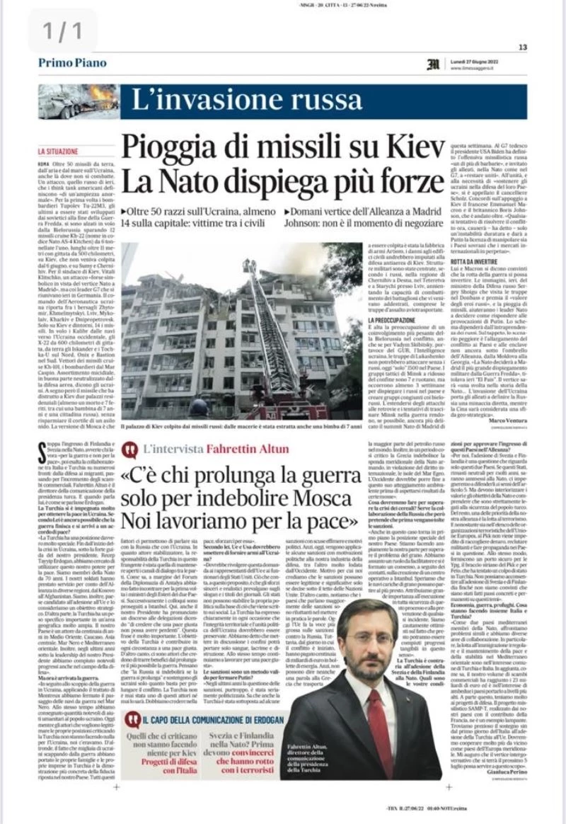 Cumhurbaşkanlığı İletişim Başkanı Fahrettin Altun, Türkiye-İtalya arasında yapılacak 3. Hükümetlerarası Zirvesi öncesi İtalya’nın önde gelen gazetelerinden Il Messaggero’nun sorularını yanıtladı.
