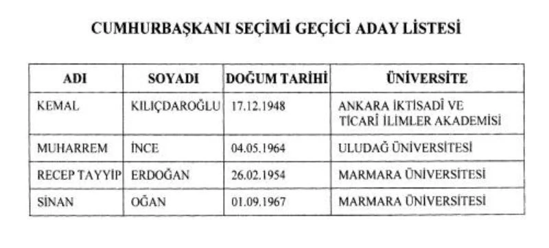 Resmi Gazete’de yayımlanan Yüksek Seçim Kurulu kararı ile geçici aday listesi yayımlandı. Karara göre Kemal Kılıçdaroğlu ve Recep Tayyip Erdoğan’ın adaylık başvuruları kabul edildi. Seçmenler tarafından aday gösterilmek için başvuruda bulunan Davut Turan, Doğu Perinçek, Erkan Trükten, Halil Murat Ünver, Hilmi Özden, İrfan Uzun, Muhammed Ali Fatih Erbakan, Muharrem İnce, Sinan Oğan, Tevfik Ahmet Özal ve Yakup Türkal için 22-27 Mart tarihleri arasında seçmenler tarafından yapılan başvuruların incelenmesi sonucunda, yüz bin seçmenin yazılı teklifiyle aday gösterilen adayların Muharrem İnce ve Sinan Oğan olduğu tespit edildi. Karara göre 14 Mayıs günü yapılacak olan seçimde Kemal Kılıçdaroğlu, Muharrem İnce, Recep Tayyip Erdoğan ve Sinan Oğan cumhurbaşkanı adayı olacak. Cumhurbaşkanı geçici aday listesine 29 Mart günü saat 17.00’ye kadar itiraz edilebilecek.